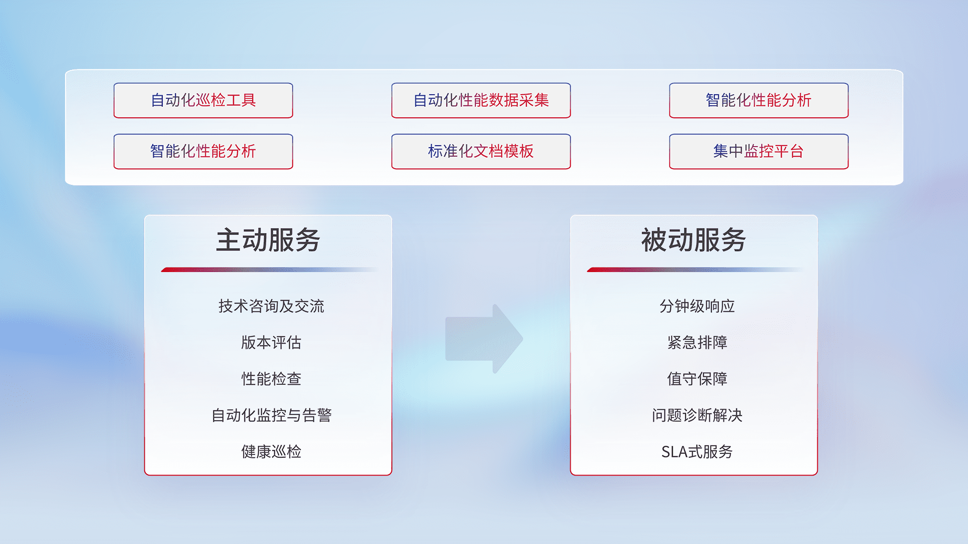 智能化工具和标准化文档,,,,保障服务质量,,,,提供主动服务(包含技术咨询、、版本评估、、、性能检查、、自动化监控与告警、、、、健康巡检)和被动服务包含(分钟级响应、、、紧急排障、、、值守保障、、问题诊断解决、、、、SLA服务)。。